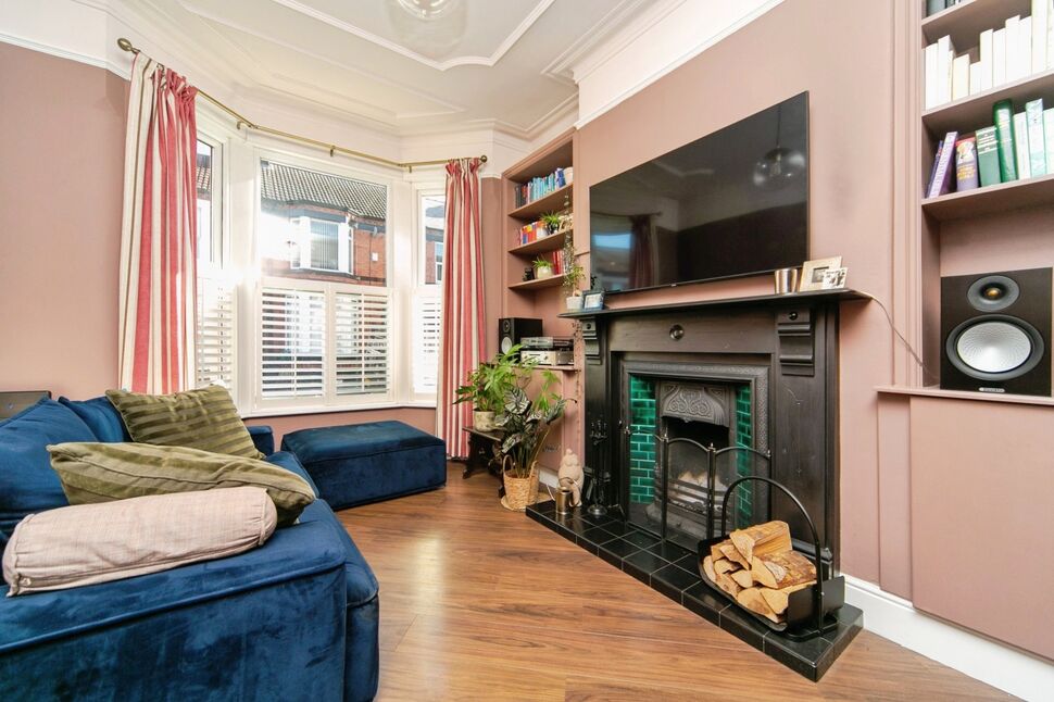 Main reception room to the front of the home with bay-fronted window and characterful fireplace.