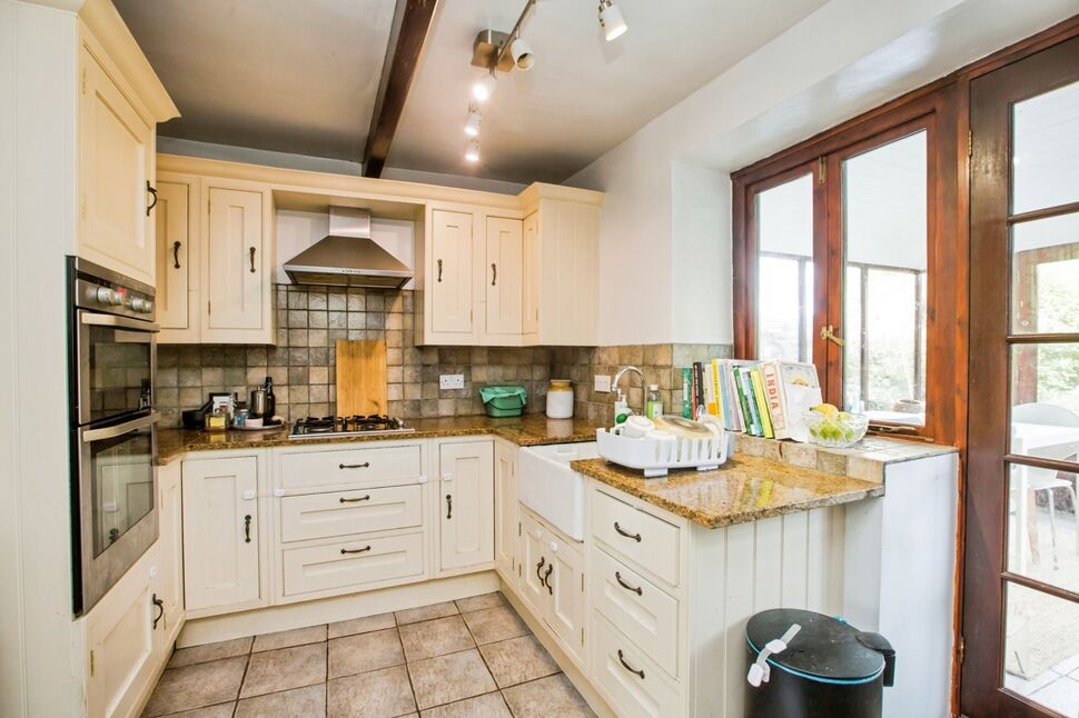 The kitchen has wall and floor units with Belfast sink and integrated gas hobs and electric oven. The units are a neutral colour to match the marble top with splash black tiles. Within the room there is cupboard space to put in a fridge freezer and washing machine.