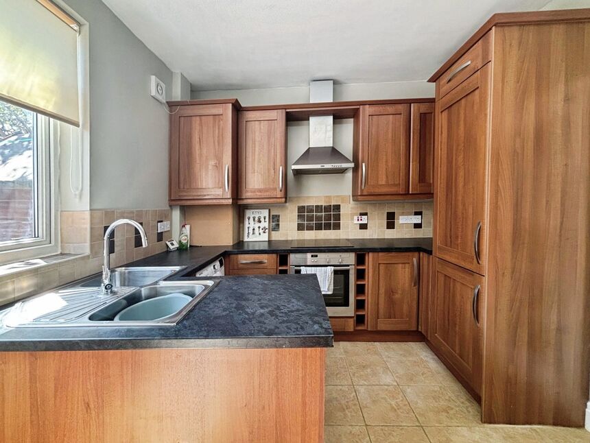 Good range of wall and base units with contrasting work surfaces incorporating two bowl sink and drainer, oven with an electric hob and a stainless steel extractor hood over. Integrated fridge freezer and dishwasher. Space for a washing machine. Part tiled walls. Under counter lighting. Radiator and ceiling light point. Stairs leading to the first floor. Double glazed window to the rear aspect. Door leading to the rear yard.