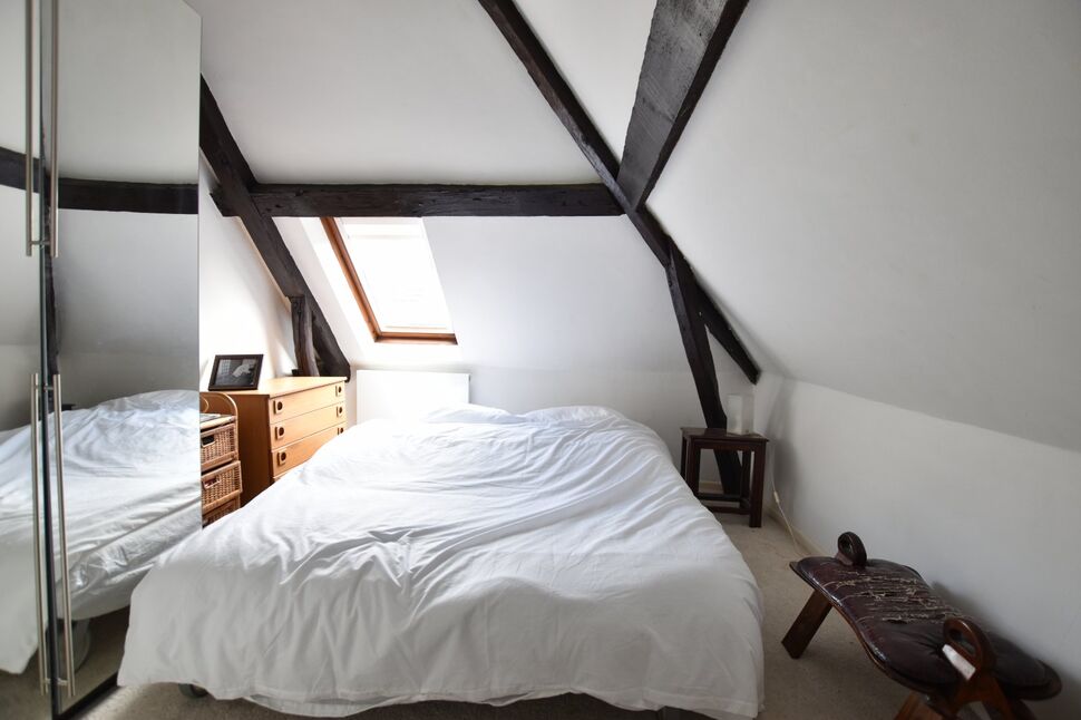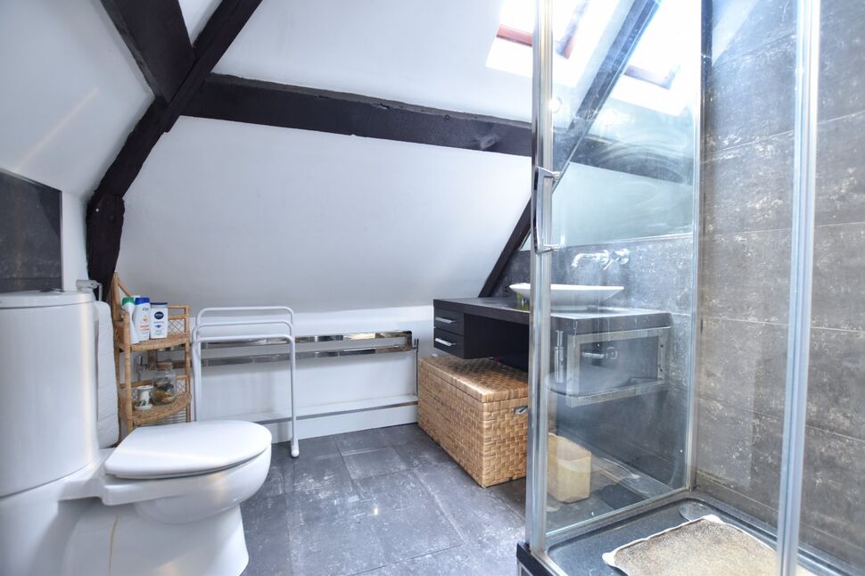 The property is approached via a footpath and the wrought iron staircase leads to the front porch which opens into the sitting room which is beamed, fitted sapelle wood units and staircase to the top floor. There is a quality shower room, W/C off the sitting room with attractive tiles and matching white suite.