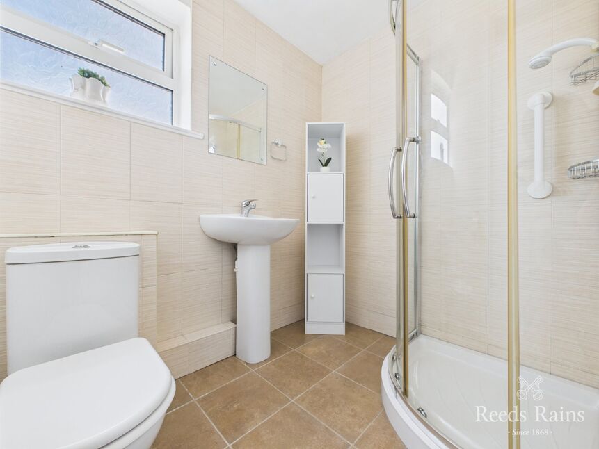 This shower room is fitted with a three-piece suite in white. It includes a large walk-in corner shower enclosure with a fitted shower unit, pedestal wash hand basin and a low-flush WC. Majority tiled to the walls and installed with a radiator. Natural light is provided from the front facing double glazed window.