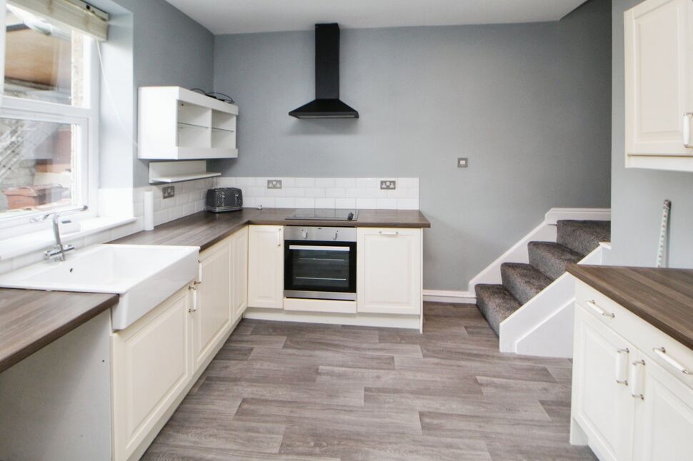Fitted with a modern range of wall, base and drawer units with wood work surfaces above. Belfast style sink, oven, hob and over head extractor, plumbing for washing machine, wall mounted boiler, under stairs storage cupboard, stairs to the first floor and UPVC door the garden.