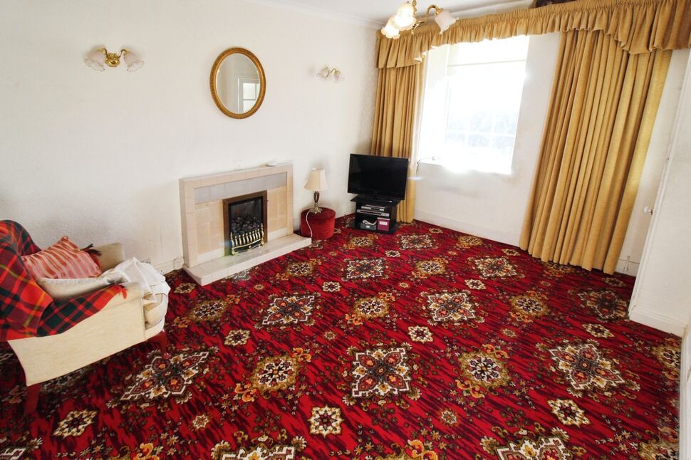 A well proportioned living room with a coal effect gas fire set within a feature twentieth century tiled surround, coving to the ceiling, radiator and deep sill uPVC double glazed window.