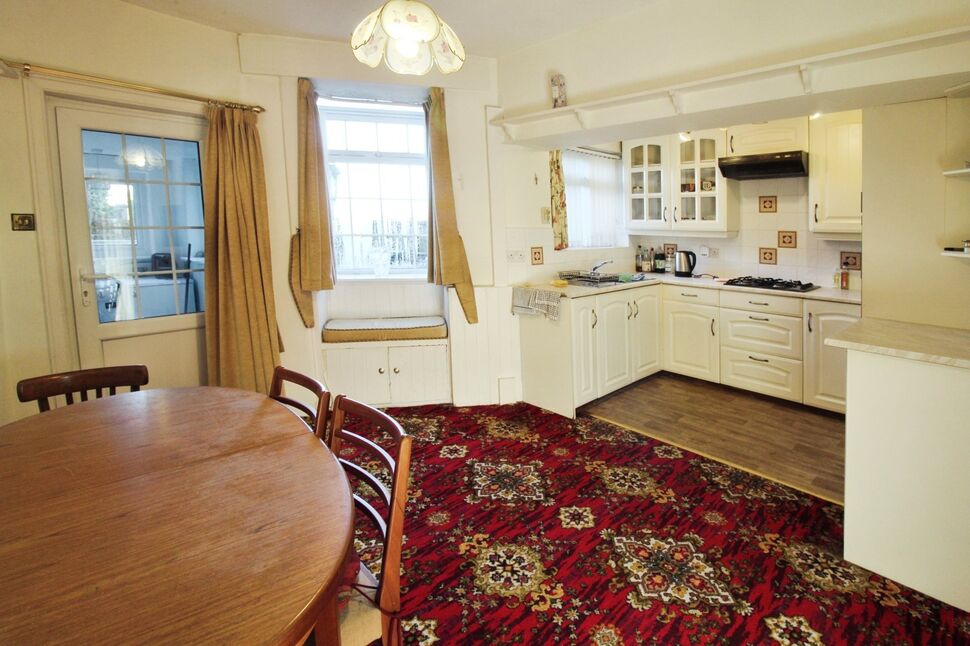 A spacious open plan family room, the kitchen area fitted with a cottage style range of wall and base units in white, complimentary work surfaces also in white with inset chrome sink unit with drainer and mixer tap, tiled splashbacks, integrated oven and separate work surface fitted gas hob with extractor over and uPVC double glazed window to the rear. The dining area boasts a useful under stairs storage area, display shelving, radiator, uPVC double glazed window with feature window seat and external uPVC frame door with double glazing leading to the rear porch.