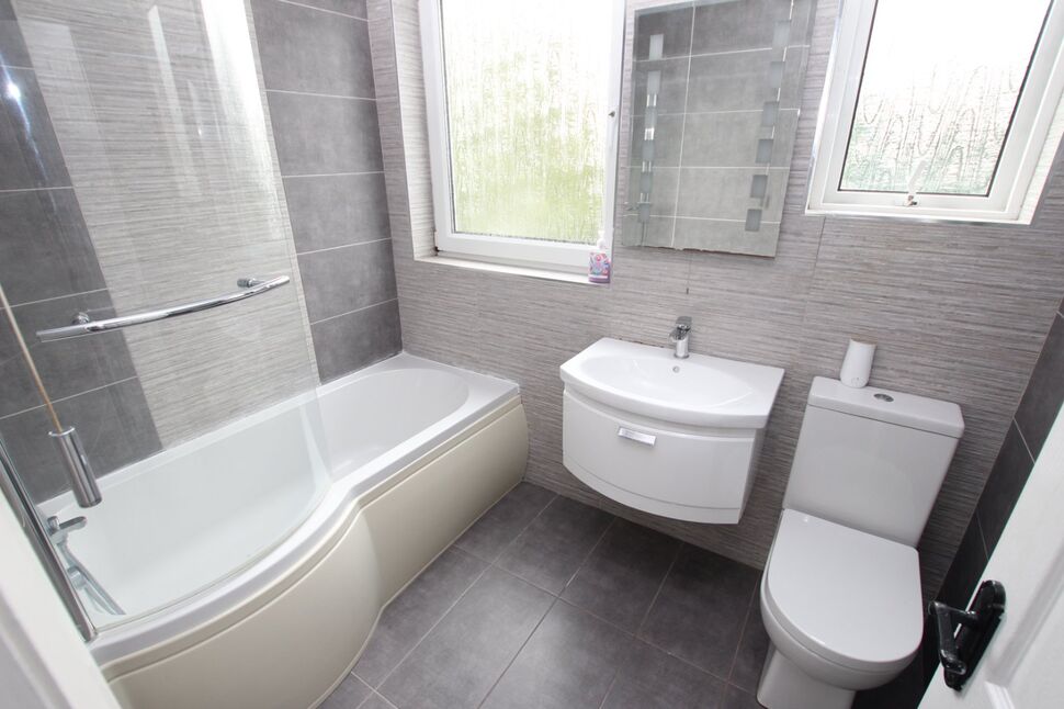 Stylish and modern bathroom suite complete with P shape bath with shower overhead. Wall mounted sink with vanity unit beneath. Low flush WC. Tiled walls and tiled flooring. Chrome heated towel rail. LED mirror.