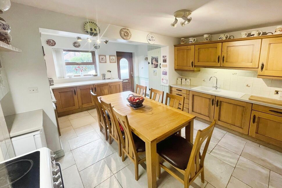 Spacious country style kitchen featuring solid wood wall and base units, ceramic sink with tap, cream tiled splashbacks with free standing cooker with over head mantle, upvc window and radiator.