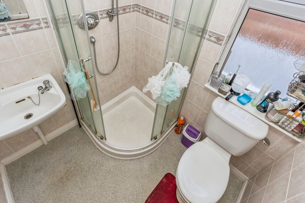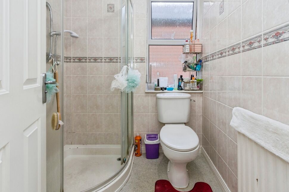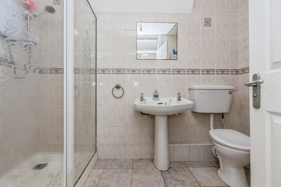 A modern shower room with shower enclosure an electric shower unit, a low flush wc, and wash hand basin. The shower room is fully tiled.