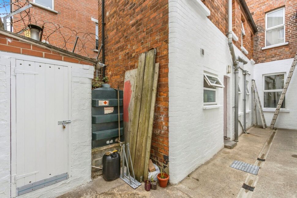 A very spacious outside yard with newly fitted yard door, outside storage unit/boiler house, and an outside tap and a light.
