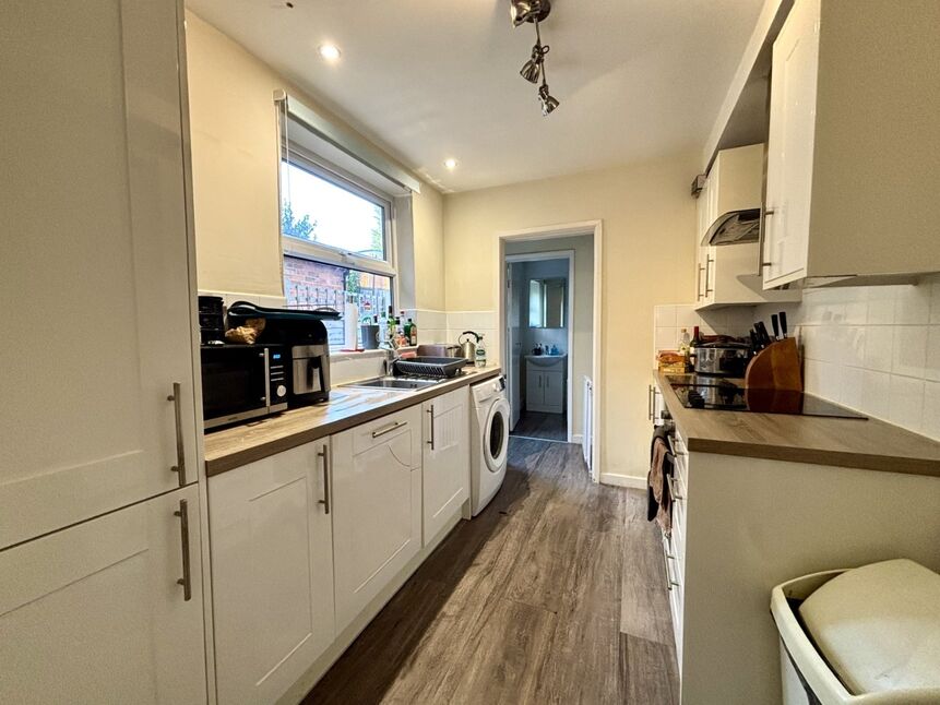 Continuing through, is the expansive living room with door leading to the kitchen. The kitchen features a range of white wall and base ‘Shaker’ style units under a butcher’s block effect worktop. Integral appliances include fridge / freezer, dishwasher, electric oven and hob.