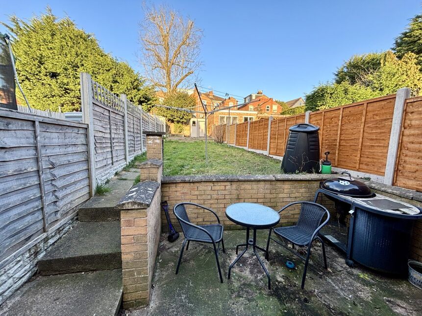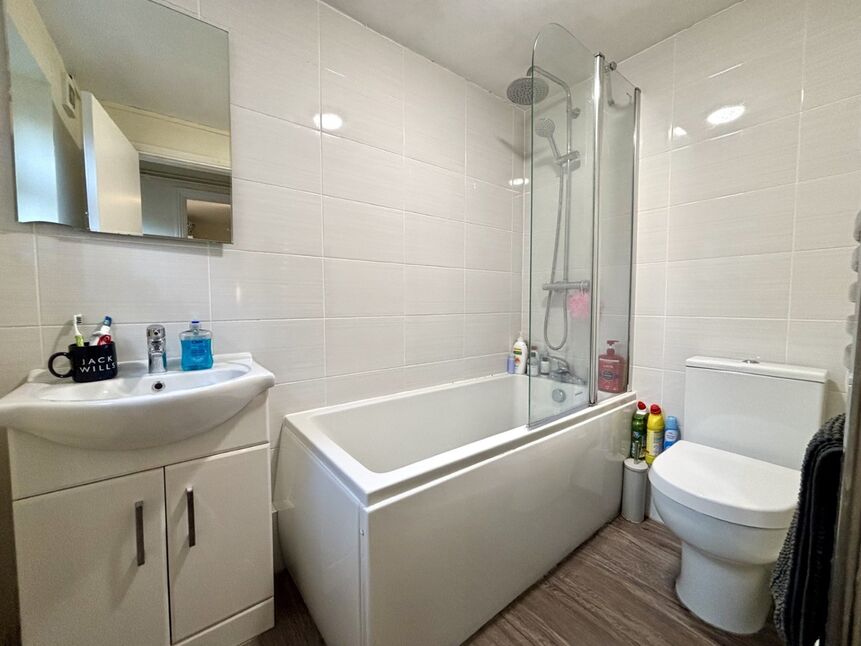 An inner hallway offers a great utility space and has a glazed door opening to the rear garden. Just off the inner hall is the modern bathroom, equipped with a white suite and shower over the bath.