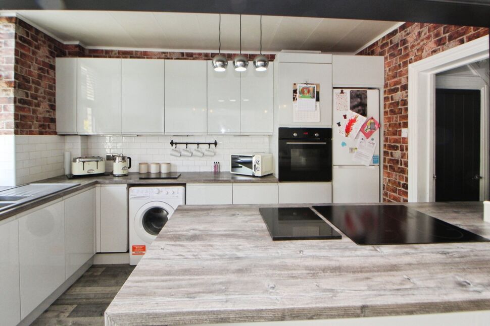 The property is accessed via a lovely entrance hall, there are two inviting reception rooms. The first is a cosy space with an appealing brick fireplace with multi fuel stove, making it the perfect area for relaxation. The second reception room offers a great dining space and has a beautiful garden view, with bi-folding doors opening onto the garden, creating an inviting indoor-outdoor living space. The kitchen features a sleek modern gloss finish. It comes with a breakfast bar, perfect for casual dining, and a built-in oven and hob, ensuring all your cooking needs are met.