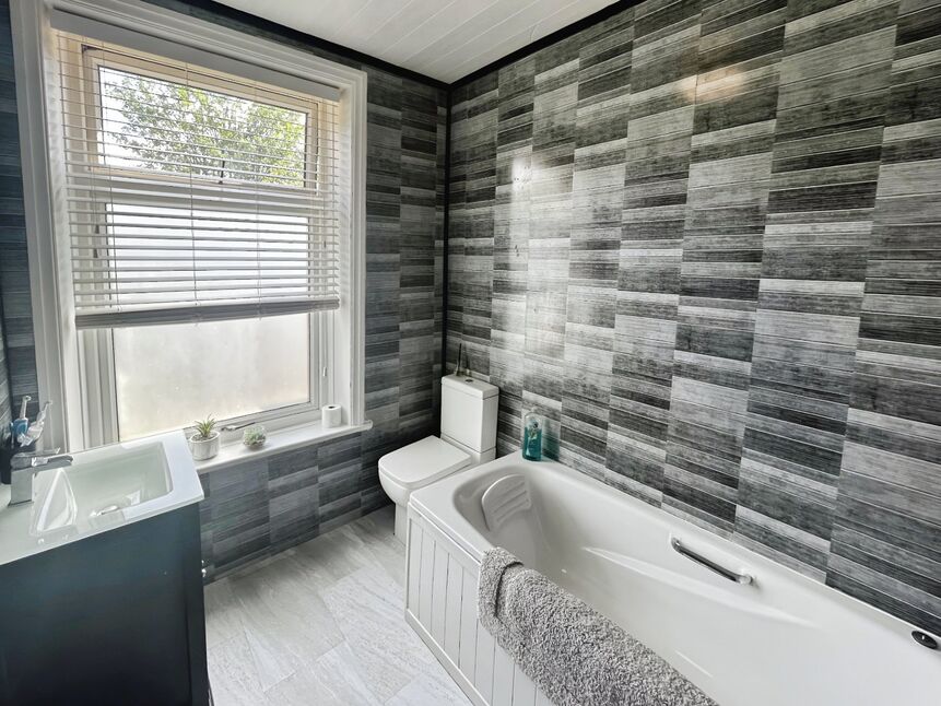The property also features a modern bathroom, with a white suite and partial tiling, offering a contemporary and stylish environment.