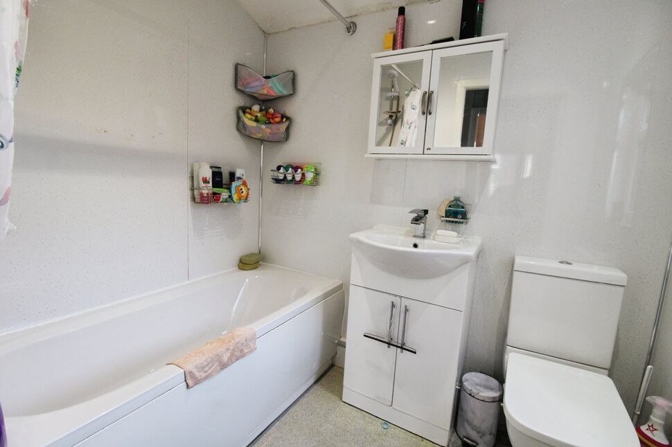 Double glazed obscure window to side, aqua boards, refitted with panel bath with shower over, vanity wash hand basin with storage beneath, WC, radiator.