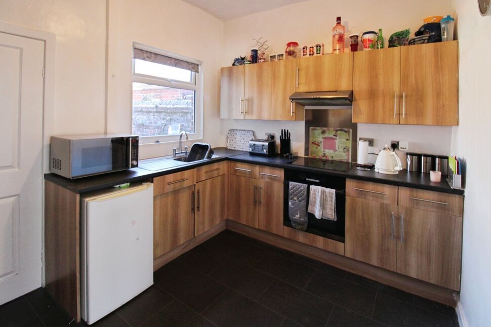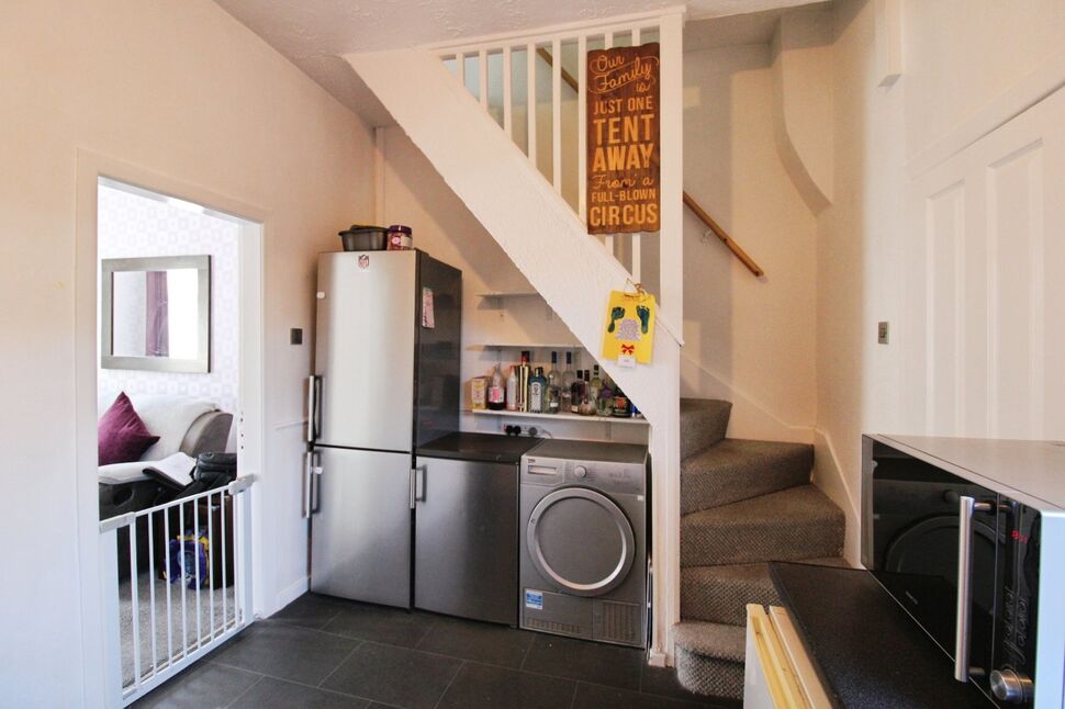 Double glazed window to rear, turning staircase to first floor, fitted with single drainer sink unit with wall and base units, inset electric hob/oven with extractor hood over, panelled door to:-