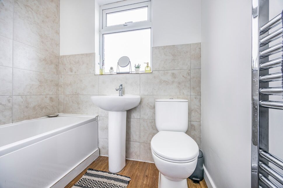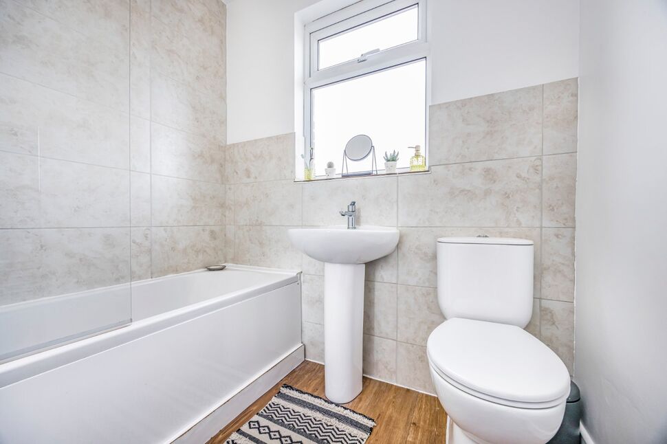 A white bathroom suite with panel enclosed bath, low level W/C and wash hand basin. Modern tiling and window to rear.