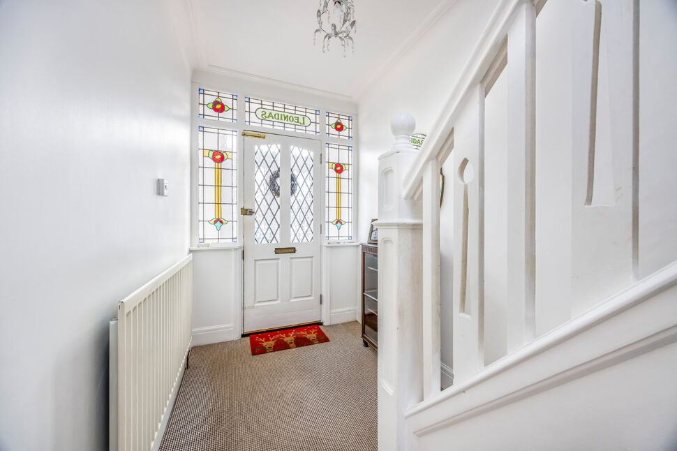A storm porch leading to a wide entrance hall with stained glass window and door. Stairs to first floor.