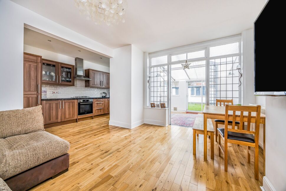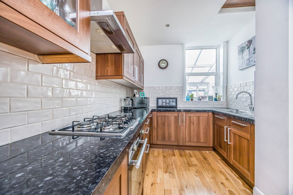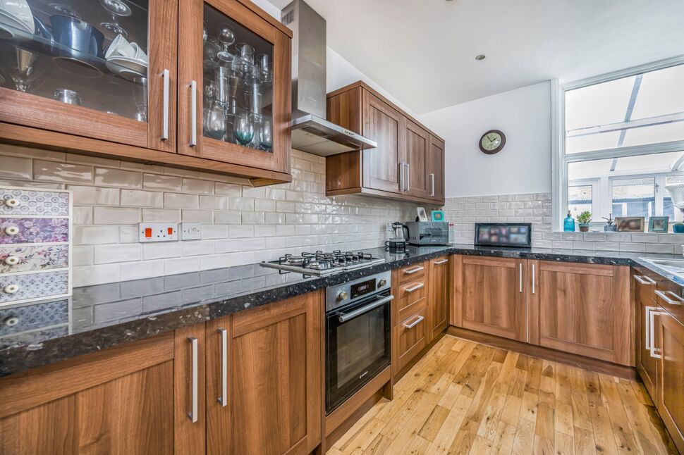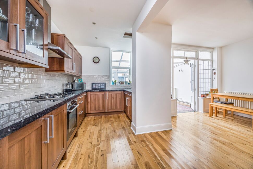 Surely the heart of the house with its polished wood flooring running seamlessly through. The kitchen offers a wealth of base and eye level units under polished square edge worksurfaces, brick style tiled splashbacks, built in oven, hob and extractor. Space and plumbing for appliances. Single sink. More then enough space for sofas and dining room table and chairs.
