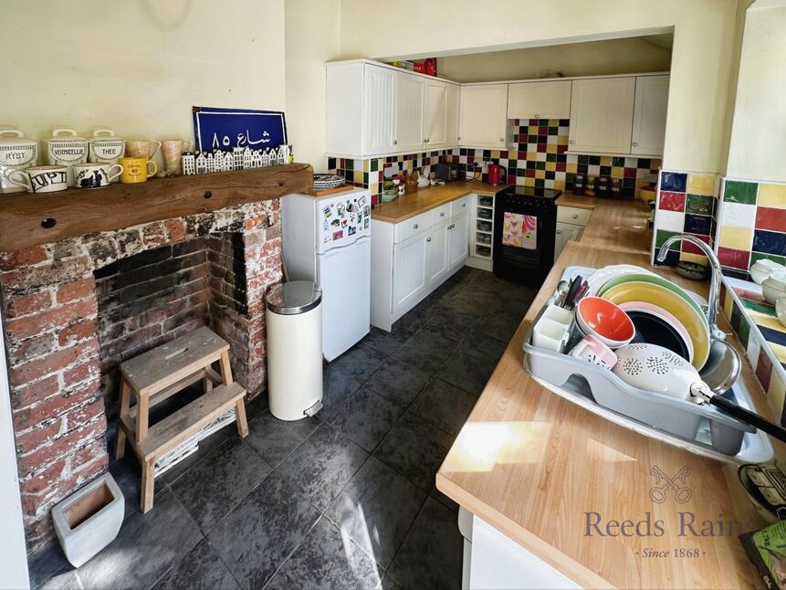 The beautiful Minton tiled hallway is a welcoming sight as you enter the property. At the heart of the home is a well-equipped kitchen, featuring base and eye-level units, perfect for any culinary enthusiast. The property also benefits from two reception rooms, both adorned with fireplaces and high ceilings, providing a sense of grandeur and space. Large windows in one reception room invite an abundance of natural light. The property is in need of some modernisation and the asking price reflects this.