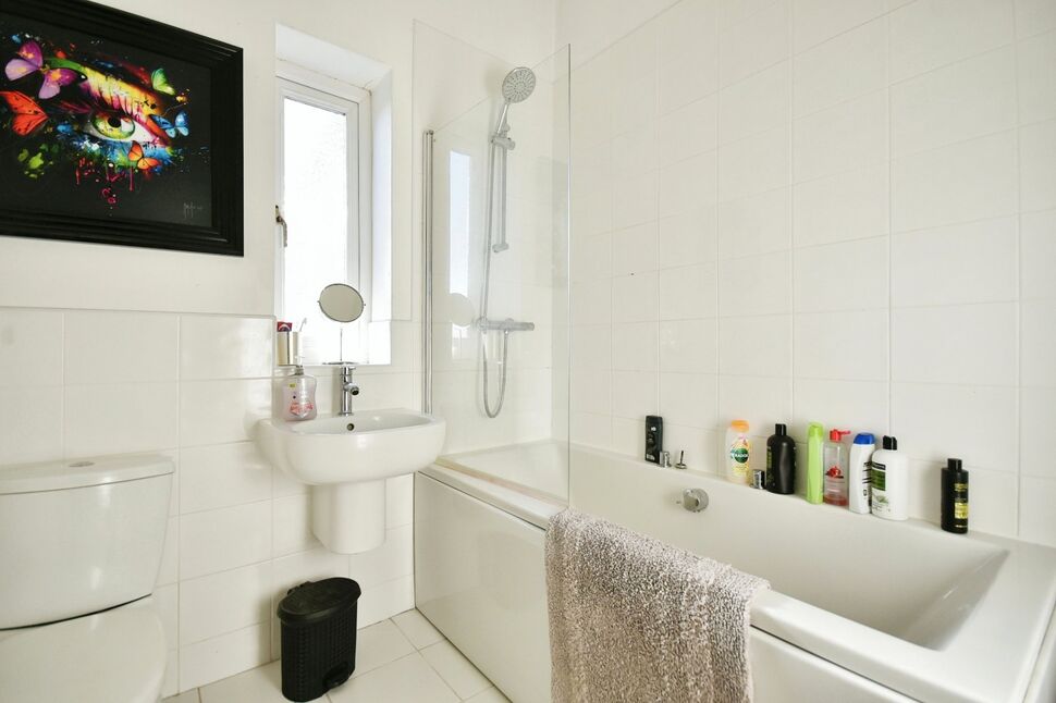 A matching three piece suite of bath with shower over. Low level wc and wash basin. Towel rail. Double glazed window to side aspect.