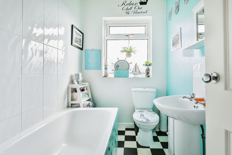 Offering a three-piece suite in white comprising panelled bath with mains fed shower over, pedestal, hand wash basin, and a dual flush w.c. The bathroom also offers a opaque UPVC window to the rear aspect, ceiling down lighters and gas central heating radiator.