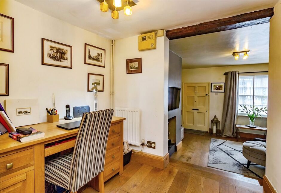 As you enter the property you step into this charming lounge, where classic character meets modern comfort. Featuring beautifully refurbished sash windows with secondary glazing, the space is bright and energy-efficient. Cosy up by the elegant electric fire, while the original flue remains intact, offering the potential for an open fire. Exposed beams add timeless charm, complemented perfectly by stunning solid oak flooring that brings warmth and sophistication to the room.