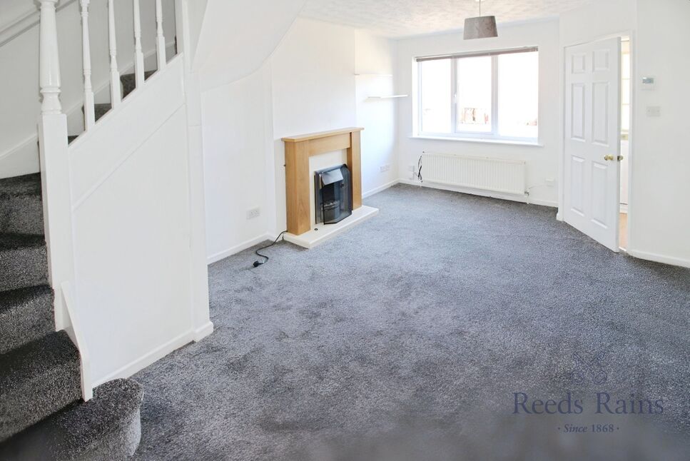 Feature fireplace surround with electric living flame fire, double panelled radiator, stairs off to first floor with storage cupboard under.