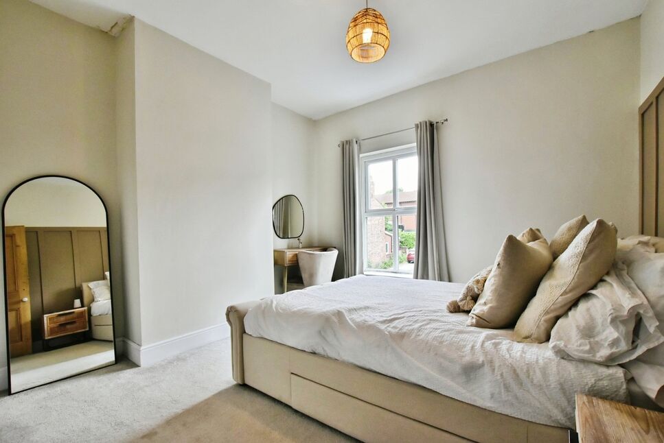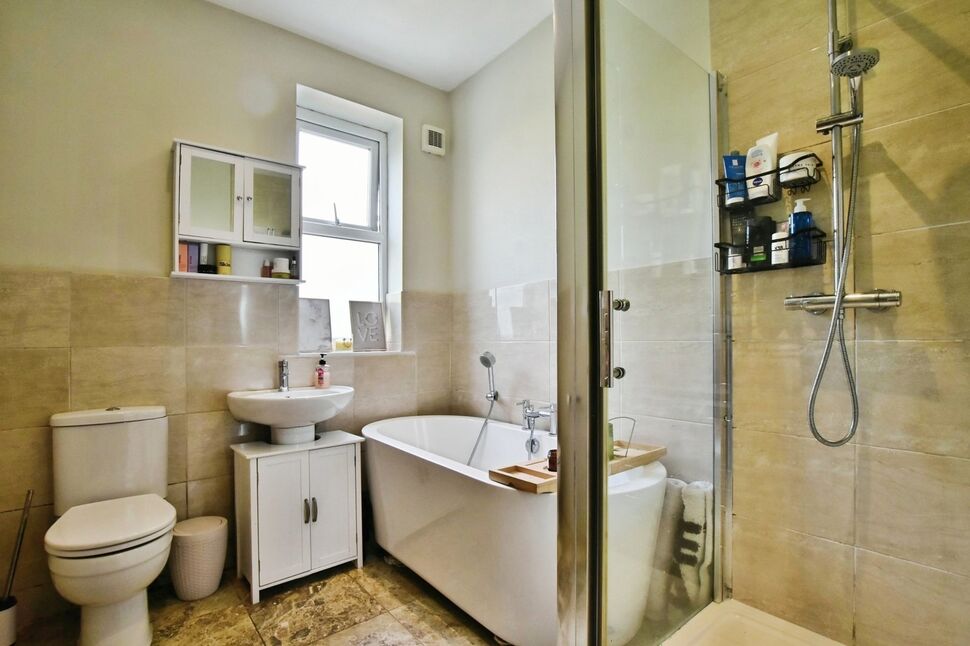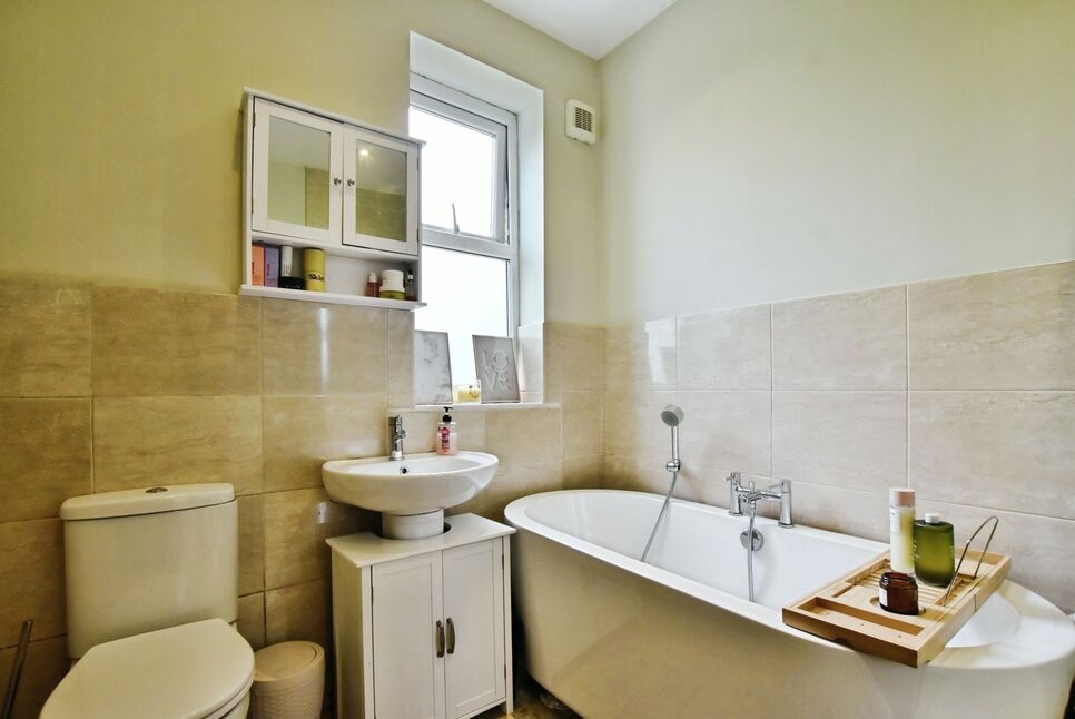 Upstairs, two double bedrooms await. The master bedroom features a panelled feature wall, bathing in natural light. The second bedroom offers a serene garden view, creating an atmosphere of tranquillity. The bathroom is beautifully presented, complete with a free-standing bath, a separate shower cubicle, and a rain shower feature.