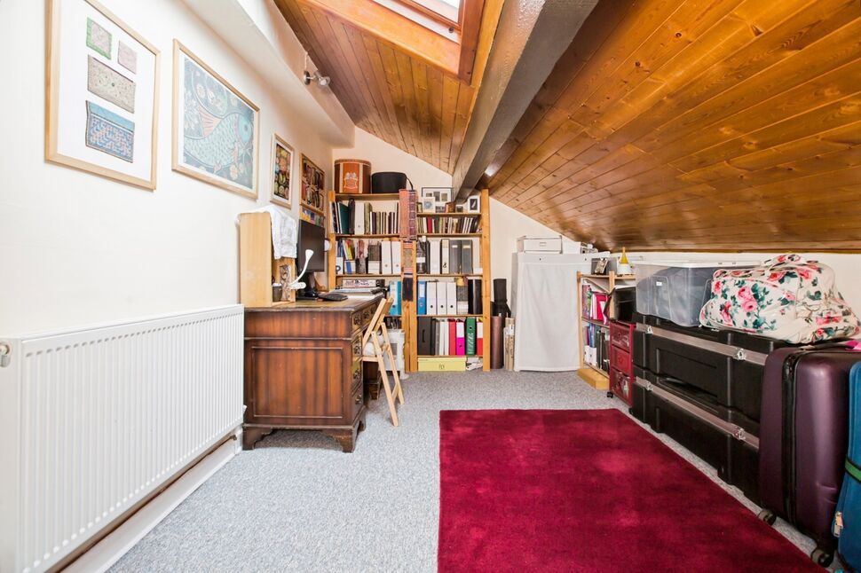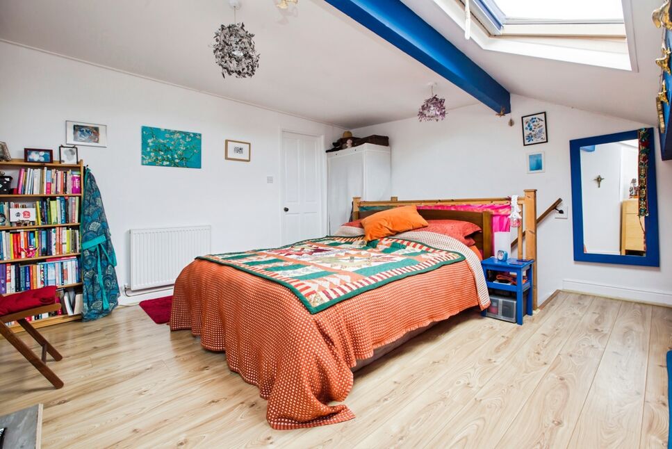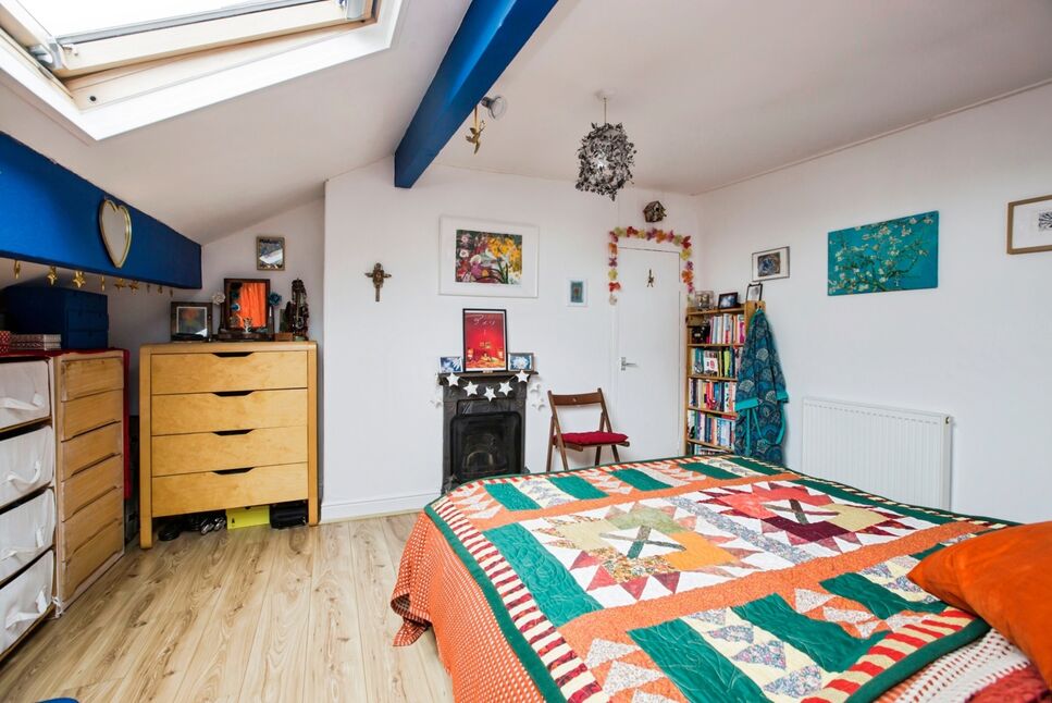 Another double bedroom located in the loft room, featuring a Velux window that fills the space with natural light and a feature cast iron fireplace adding character. The room also benefits from useful under-eaves storage.