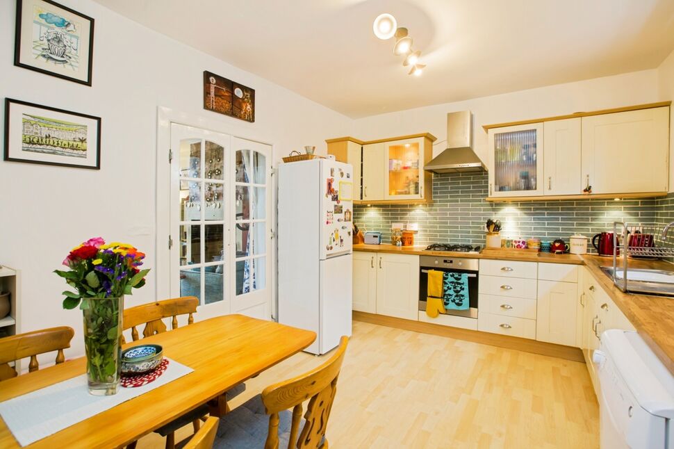 A bright kitchen, featuring modern cream units. The space is thoughtfully designed with plumbing in place for both a dishwasher and washing machine. A rear-facing window allows a lot of light into the room, while double doors open onto the living room allowing you to enjoy the beautiful views. There's ample room for a dining table, perfect for family meals or entertaining. The boiler is also located in this room and is neatly concealed within a boxed-in unit.