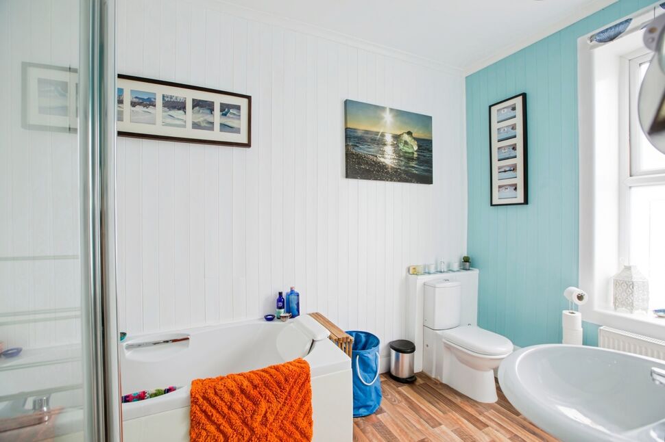 A well-appointed four-piece bathroom suite, comprising a wash basin, WC, bath, and a separate shower cubicle. A large frosted window allows plenty of natural light to fill the room while maintaining privacy. There is also a large airing cupboard located in this room.