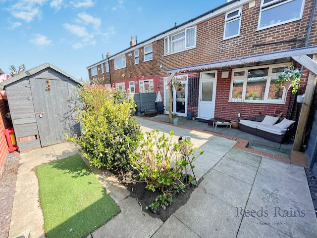 A beautifully presented three bedroom mid terrace property perfect for all buyers requiring no work. The property offers a great family home in an excellent area of Urmston within close proximity to popular schools and transport links. Internal viewing will reveal a welcoming entrance hallway, a converted garage creating an additional reception room, living room with French doors to the rear garden and a spacious kitchen. The first floor features three generous bedrooms, a bathroom and a separate WC. Externally a driveway provides off road parking leading to a well maintained rear garden with a Pergola for outside dining.