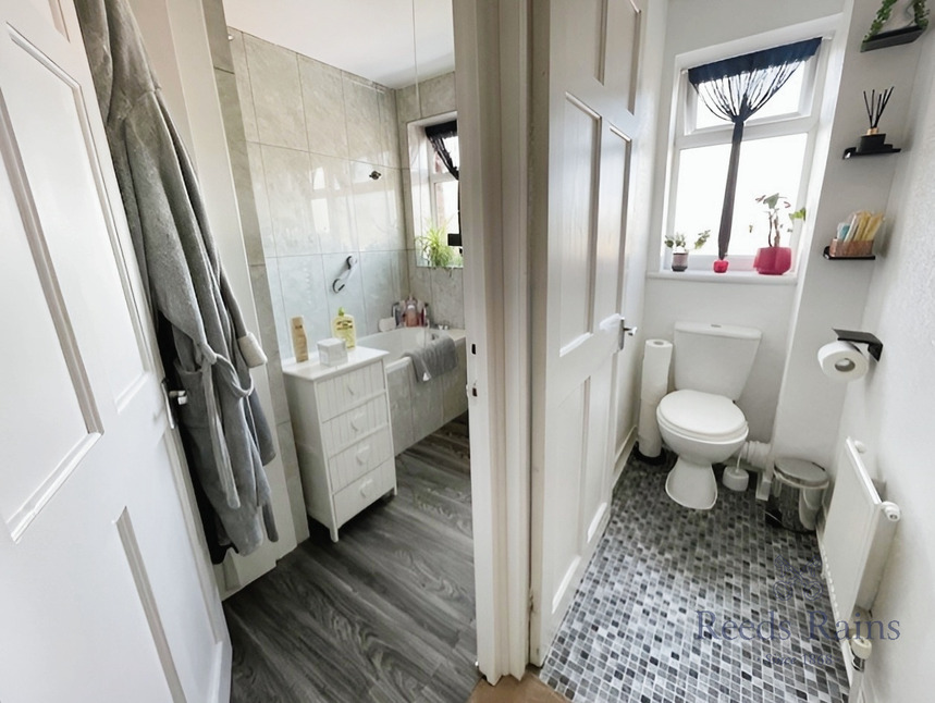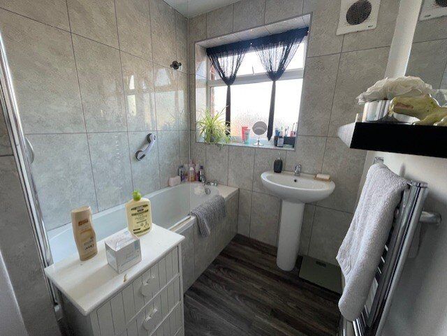 A stylish modern bathroom is fully tiled with a matching tiled panelled bath and shower above, pedestal wash hand basin, laminate flooring, heated towel rail, built in cupboard and a uPVC double glazed window to the rear elevation.