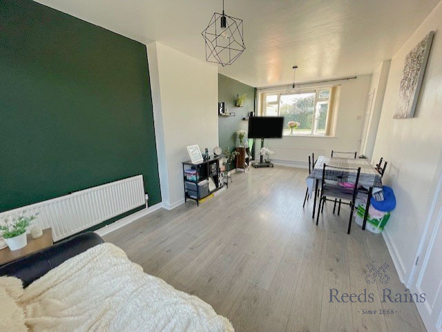 A generous size living room features a uPBC double glazed window to the front elevation, excellent French doors proving access to the rear garden, laminate flooring a radiator and space for a dining table.