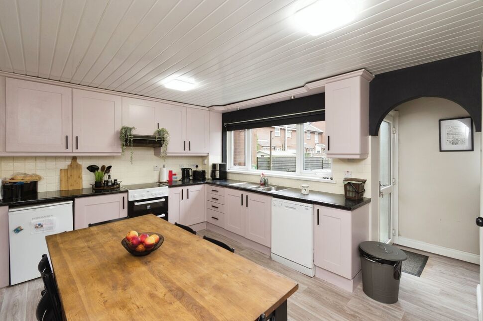 Extensive range of high and low level units, plumbed for dishwashe, laminate work tops, single drainer stainless steel sink unit, panelled ceiling, casual dining area open plan.