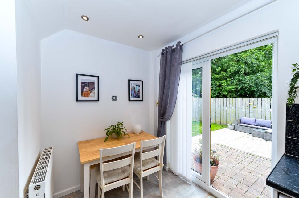 One and 1/2 bowl sink unit with chrome dual mixer tap. Excellent range of high and low level units with formica work surfaces. Integrated four ring electric hob and built in oven with chimney extractor hood. Plumbed for washing machine. Space for fridge / freezer. Partly tiled walls. Recessed spotlighting. Under stairs storage. Ample dining area. Recessed spotlighting. uPVC French doors to enclosed rear garden.