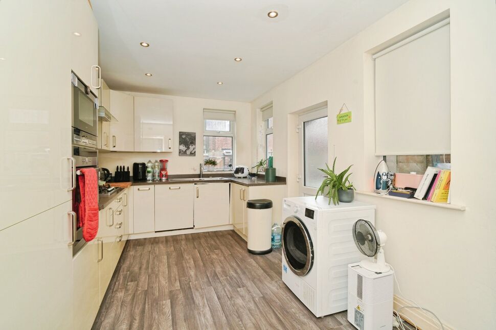 A open-plan kitchen/dining room is fitted with a range of base and wall units with a complimentary work surface over, stainless steel sink with a drainer unit and mixer tap, integrated oven with a 5-ring gas hob and a extractor hood above, integrated fridge/freezer, integrated dishwasher, radiator, a uPVC double glazed window to the side and rear elevation and a uPVC door leading to the rear garden.