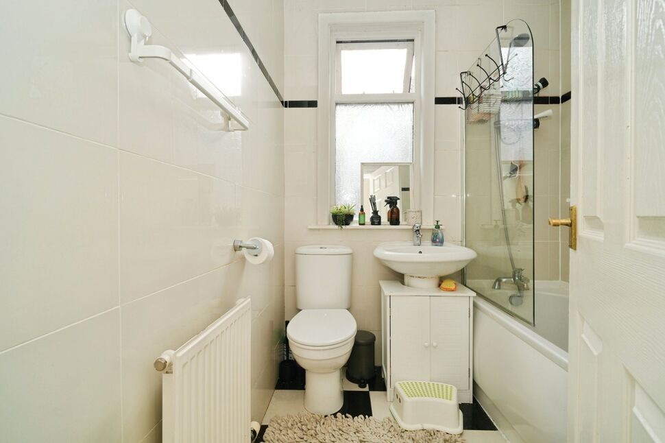 A white bathroom suite is fitted is fully tiled and features a panelled bath and a shower above, a low level WC, pedestal wash hand basin, radiator and a uPVC double glazed opaque window to the rear elevation.