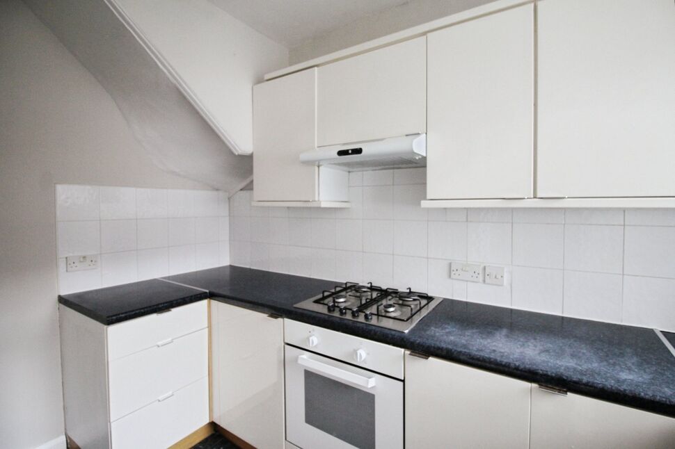 Fitted with a range of wall and base units. Work-surfaces incorporating a sink and drainer unit with tiled splash backs. Integral gas hob and oven with an extractor hood over. Space and plumbing for a washing machine. Front facing double glazed window.