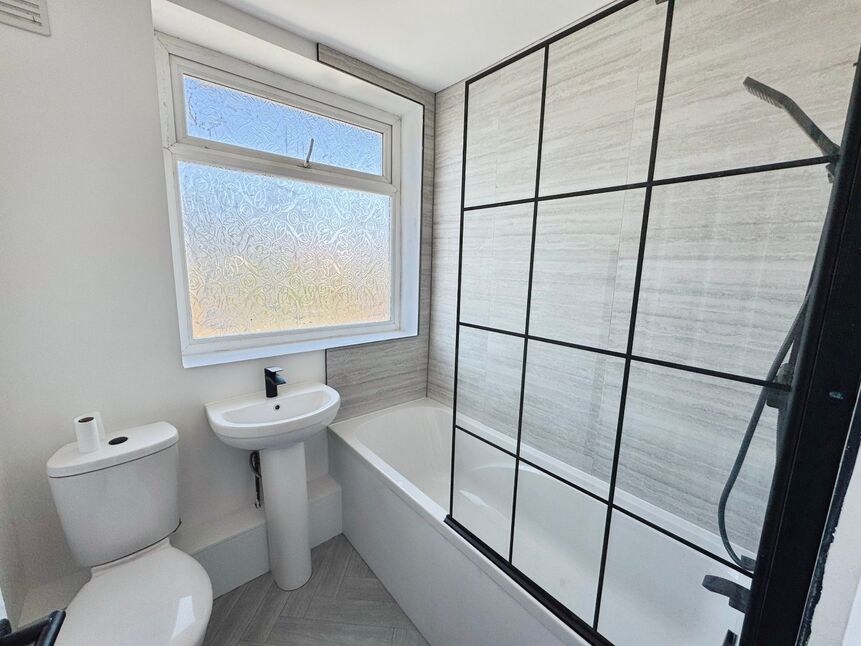 Window to rear, ceiling light point, wash hand basin, bath with shower over, heated towel rail, w/c, flooring.