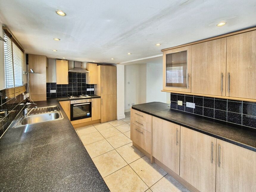 Appointed with range of matching wall and base units with work surfaces incorporating electric oven and gas hob, a sink unit and drainer. Window and door to the rear aspect.