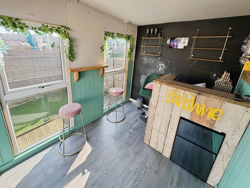 The property has an elevated position with tiered gardens to the front accessed via a few steps. The rear garden has a large decking area with turfed grass to the rear. A double driveway sits the to back on the property and is accessed via a side road. A real benefit with the garden is the BAR/SUMMER HOUSE which includes full power and would make an ideal Home Office.