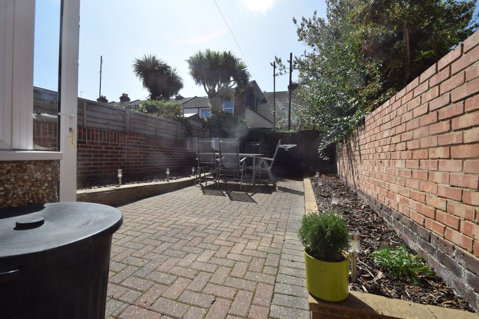 An enclosed south facing garden or relatively decent size. Laid to patio with borders.
