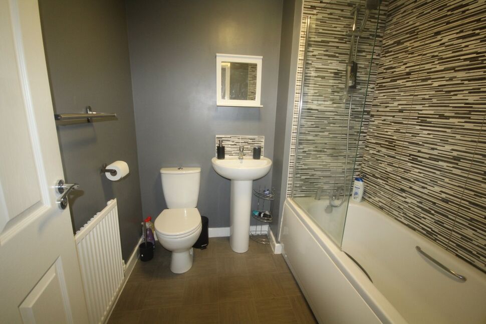 Modern white suite comprises panel bath with shower over and shower screen. Pedestal wash had basin. Tiled to splash back areas, radiator and double glazed window.