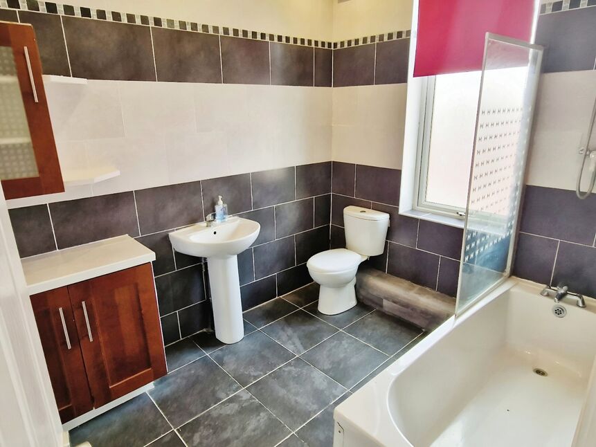 Modern three piece suite comprising of low level WC, pedestal wash hand basin and bath. Tiled flooring with partly tiled walls with a window to the side aspect.