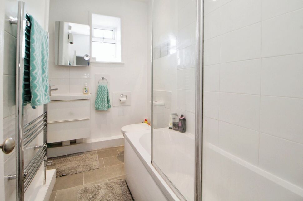 Three piece white suite comprising; panelled bath with shower over, floating vanity unit with mixer tap and WC. Recessed ceiling lighting, extractor fan, part tiled walls, wall mounted combi boiler, built in cupboard and chrome towel radiator.