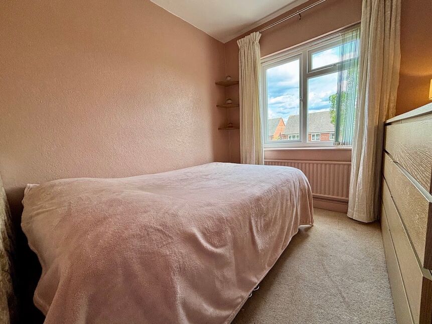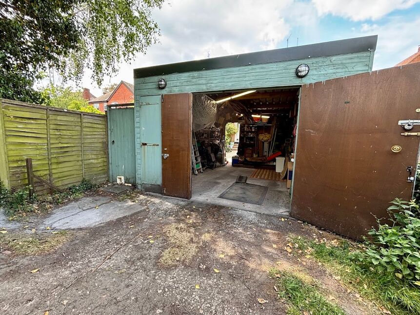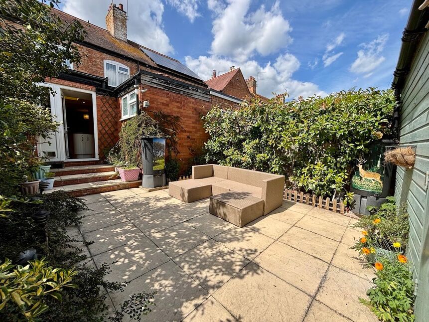 The rear garden features a westerly aspect and is laid to patio with mature borders and hedgerows, with access provided to the detached garage.