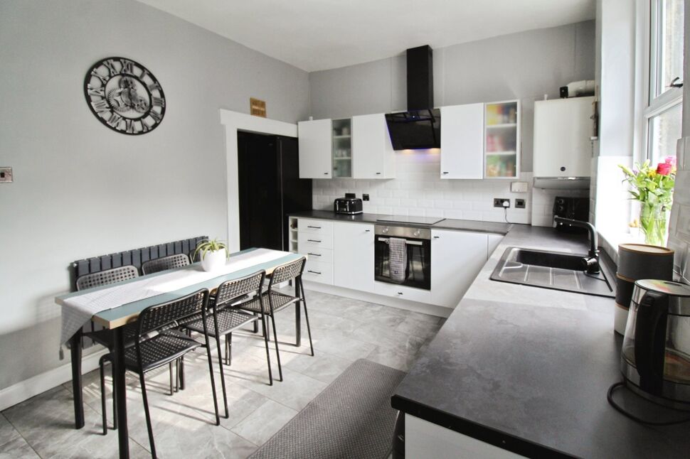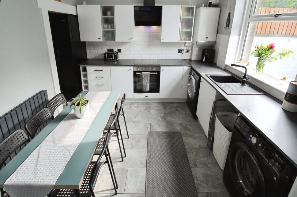A lovely family space with tiled flooring, fitted with a contemporary matching range of wall and base units in white, contrasting work surfaces in a black/grey finish with inset sink unit and drainer in black with complimentary black mixer tap, white 'brick' effect tiled splashbacks, integrated electric oven, separate work surface fitted ceramic hob with contemporary extractor over, ample space for a family dining table and chairs, anthracite coloured radiator, open under stairs pantry, uPVC double glazed window and uPVC external door to the rear.