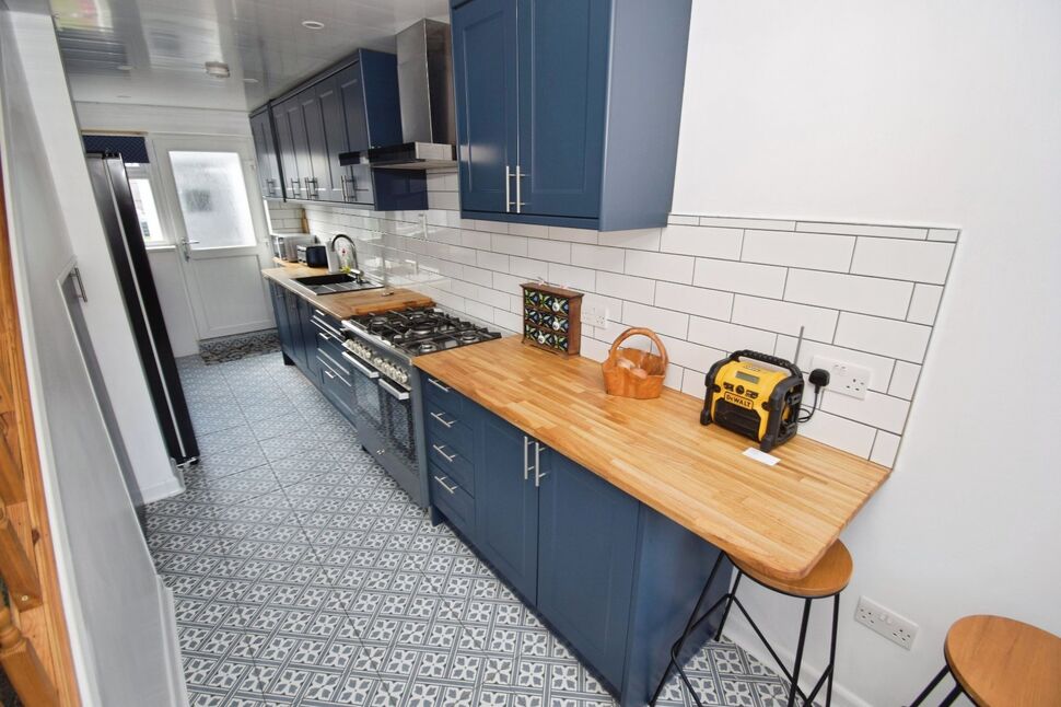 Newly fitted kitchen with a range of base and overhead units, sink, drawers, Solid Wood working surfaces, Kenwood range with five ring gas hob and electric double ovens, integrated dishwasher and washing machine, space for fridge freezer, door leading to rear, Window to front stairs to first floor.