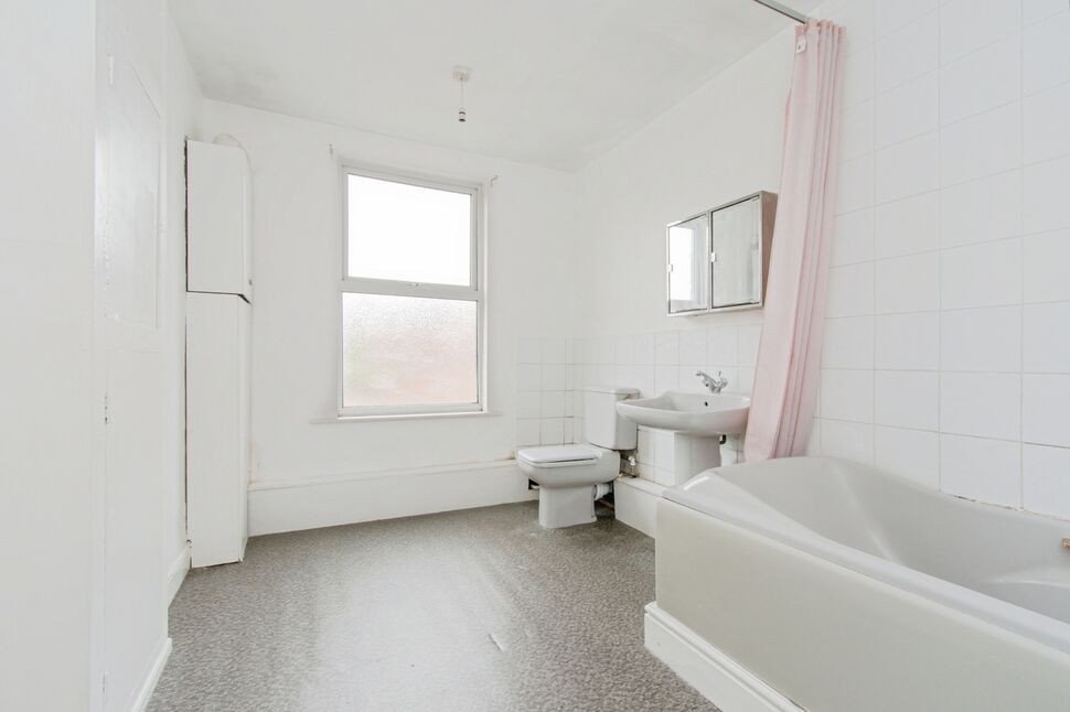 Comprises of a low level WC, a pedestal wash basin with a chrome effect mixer tap inset and a panelled bath with a chrome effect mixer tap and shower head over. Tiles to splash back areas, storage cupboards, a central heating radiator and a window overlooks the rear aspect.