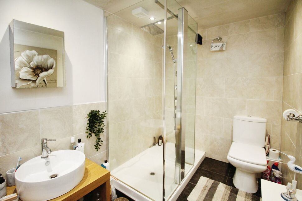 Walk in shower cubicle with mains fed shower over, hand wash basin with mixer tap over, W.C., part tiled walls and tiled floor, heated towel rail.